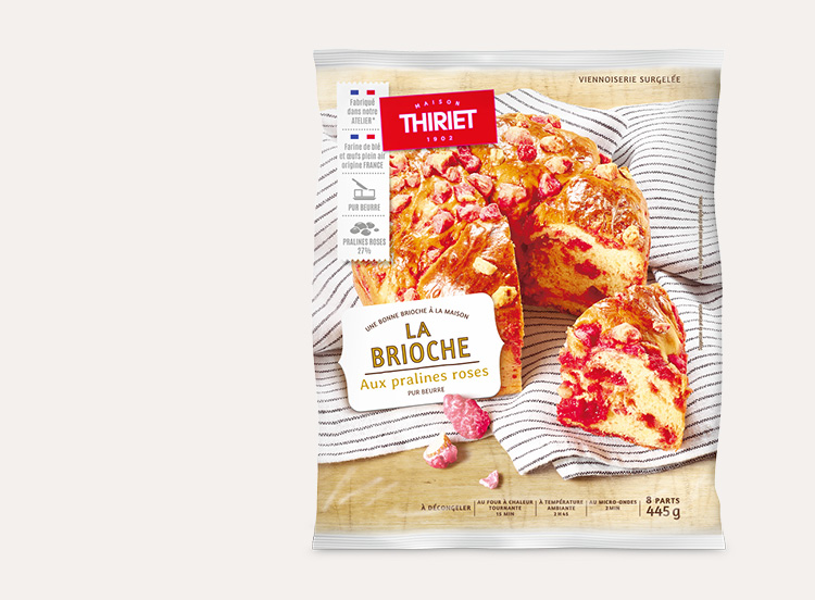 Retrouvez tout le savoir-faire de la Maison Thiriet avec cette nouveauté ultra gourmande ! Cette brioche pur beurre, réalisée à partir de farine de blé et œufs frais origine France, renferme de délicieuses pralines roses. Parfaite pour le goûter ou le petit déjeuner !