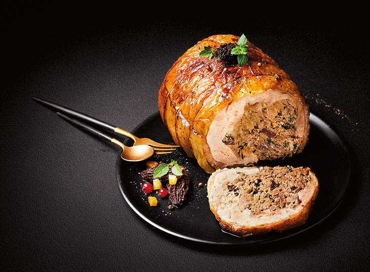 Un rôti de chapon à la chair tendre à souhait, où se cache une délicieuse farce aux morilles et Vieil Armagnac. Volaille entière désossée, origine France.